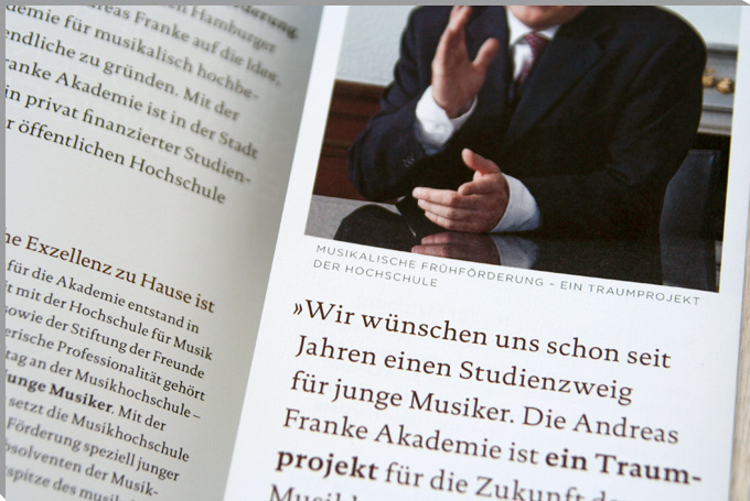 The Andreas Franke Academy supports young highly talented musicians with a stipend. In close cooperation with the academy for music and theatre in Hamburg (Hochschule für Musik und Theater) the Andreas Franke Academy arranges for public concerts and individual training. A well-known Hamburg patron is the eponym of the academy.