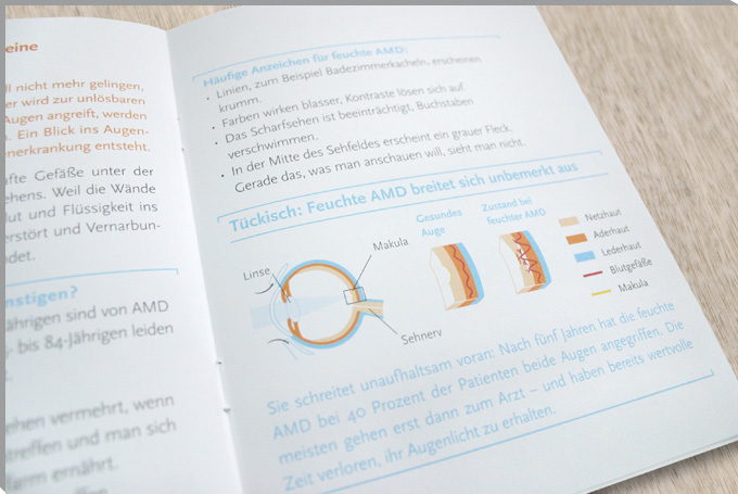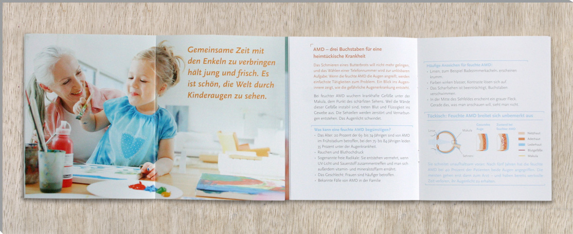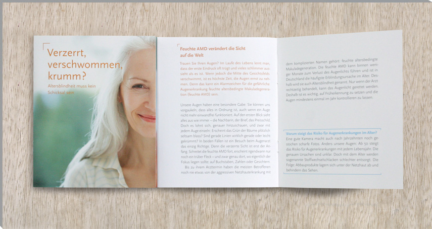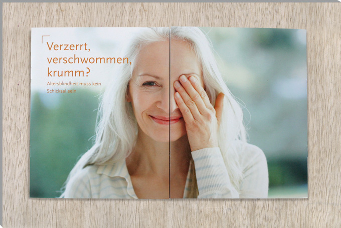 The brochure »Verzerrt, verschwommen, krumm?« (›Warped, out of focus, bent?‹) informs on age-related eye diseases. The brochure is devided into two parts: the right part of the brochure contains the informative text while the left side presents more emotional images.
